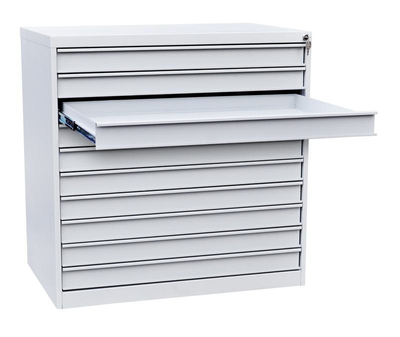 Шкаф ШК-10(А1) оборудован десятью выдвижными ящиками на телескопических направляющих, в которых с удобством размещаются документы формата А1. Внутренние размеры ящиков — 50x905x600 мм.