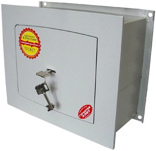 Лицевая панель и дверь производятся из листовой стали в пять миллиметров; предусмотрено армирование в ходе установки. Дверь снабжена усиленными внутренними петлями и раскрывается под углом 90°. Запирание производится с помощью двухригельного ключевого замка KABA MAUER высокого качества (класс В по стандарту ГОСТ). Область замка укреплена твердосплавной пластиной, оберегающей замок от воздействия инструментов взлома.